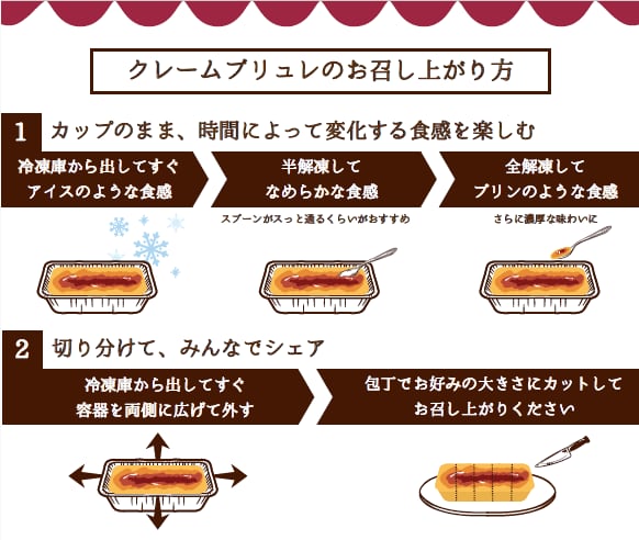 冷凍庫から取り出しすぐに容器を外して、お好みの大きさに包丁でカットしお召し上がりいただけます。